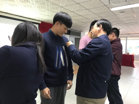 老师为学代表佩戴团徽